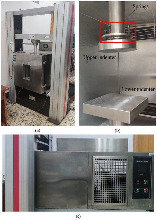 Test devices in this study. (a) WDW-100E electronic universal testing machine, (b) testing zone, (c) low-temperature test chamber.