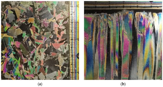 The ice crystal structures of the thin sections cut horizontally and vertically in the laboratory were observed utilizing the method outlined in Section 2 and are shown in Figure 6. It can be seen that the ice sample used in the test was columnar ice, and the reasons for its formation could be explained as follows: the temperature in the low-temperature laboratory was almost constant throughout the freezing process, and the wind speed only caused certain disturbance to the water surface at the initial stage of freezing. When the surface was frozen, the air and water did not continue to be in direct contact, and the water body remained static, so the ice crystal had a stable growth environment and the crystal had enough time and space to grow stably. Each crystal could only grow downward because it was limited by other crystals around it, resulting in a columnar structure in the ice crystal.