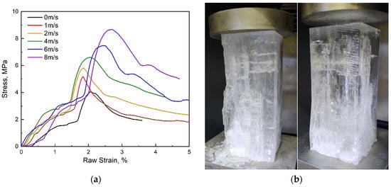 Ice undergoes ductile failure at low strain rates, and the stress–strain curve is shown in Figure 8. In the initial stage, the stress–strain curve often exhibited a nonlinear growth phase due to reasons such as uneven specimen cross-sections and incomplete contact between the indenter and the specimen. Before reaching the maximum stress value, there was a linear segment in the stress–strain curve, which reflected the linear deformation borne by the ice sample. Subsequently, the ice sample began to yield, and the stress gradually transitioned to its maximum value and began to decrease as deformation increased. In the ductile regime, slow loading induced noticeable deformation with minimal crack formation. As the loading rate increased, the number of cracks proliferated, resulting in longitudinal cleavage cracks that may penetrate through the specimen, causing it to expand. After losing strength, the ice sample remained structurally intact.