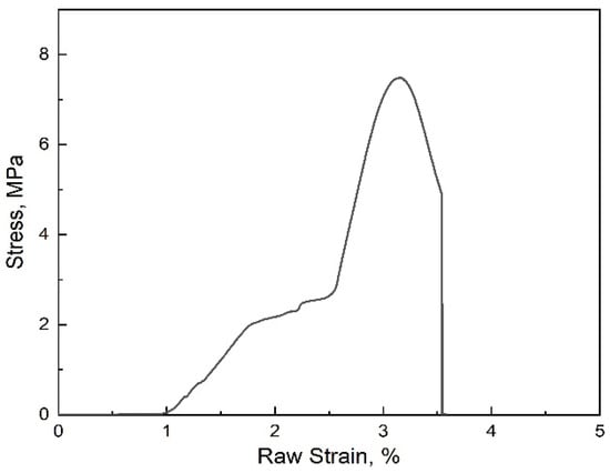 Stress–strain curve with both ductile and brittle characteristics. The sample was from ice grown at a wind speed of 0 m/s and the loading strain rate was 1 × 10−4 s−1.
