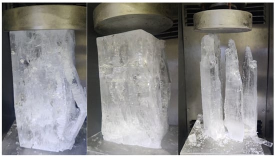 In this study, the strain rate range was from 10−6 s−1 to 10−2 s−1 and the loading direction was parallel to the ice crystal long axis. The test procedure is as follows: (1) Set the low-temperature test chamber to −10 °C and wait for it to reach thermal equilibrium. (2) Measure the length, width, and height of the ice specimen, seal it in a plastic bag, and then place it in the low-temperature test chamber for at least 24 h. (3) Position the specimen centrally beneath the lower plate. (4) Activate the testing machine control and data acquisition system. Adjust the position of the upper plate to make contact with the upper surface of the specimen and allow sufficient time for temperature stabilization to minimize temperature disturbances during specimen placement. (5) Configure the test parameters and start loading. (6) Cease loading immediately upon specimen failure. Capture photographs of the failed specimen. (7) Remove the failed specimen, clean any debris, and prepare for next test.