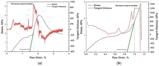 In the initial stage of compression testing, it was possible that the testing indenter did not fully conform to the surface of the sample. From the stress–strain curve, it can be observed that the curve initially rose rapidly after the start of the test, then flattened slightly, and subsequently increased linearly with a greater slope. Before the linear increase, the sample did not experience its true stress. Therefore, the correction of the stress–strain curve was necessary. Arakawa [] proposed using the tangent modulus to estimate the true zero point of the stress–strain curve. The tangent modulus at a certain point on the curve was calculated by the ratio of the change in stress to the change in strain near that point. As shown in Figure 12a, the experimental results of a strain rate of 10−5 s−1 at a wind speed of 0 m/s demonstrated how the stress–strain curve was corrected when ice exhibited ductile behavior at low strain rates. When the raw strain reached 1.61%, the sample surface fully adhered to the pressure head, and the tangent modulus rose rapidly. It reached its maximum value of 917.44 MPa at a raw strain of 1.72%. By identifying the strain corresponding to the maximum tangent modulus, an auxiliary line (green line in Figure 12a) was drawn on the stress–strain curve with a slope equal to the maximum tangent modulus, intersecting the x-axis at the corrected zero point, which was 1.48% raw strain. After reaching its maximum value, the tangent modulus decreased rapidly with increasing strain. When the tangent modulus decreased to 0, the stress reached its maximum value of 4.06 MPa, defined as the maximum compressive strength under this condition, corresponding to a corrected strain of 0.58%. After reaching the peak, both the stress and tangent modulus decreased rapidly with increasing strain. The tangent modulus reached its minimum value at a corrected strain of 0.97%, and then gradually increased again, with the rate of decrease in stress also decreasing gradually until the stress eventually stabilized, and the tangent modulus approached 0. The method for correcting the stress–strain curve under brittle behavior at high strain rates was the same as for ductile behavior, as shown in Figure 12b.