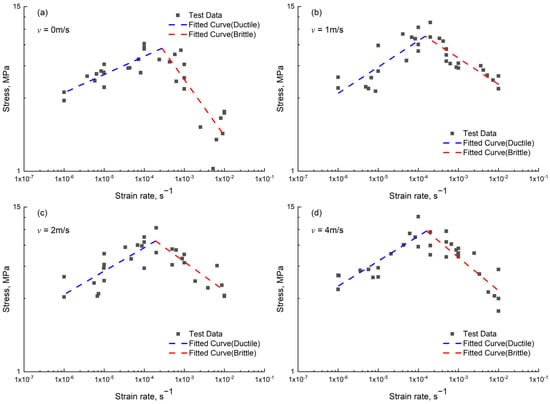 Observation of the scatter plot revealed that, within the ductile regime, the relationship between uniaxial compressive strength and strain rate followed a power–law function, consistent with the findings of Glen [] in his study of ice creep characteristics. This relationship is expressed as: