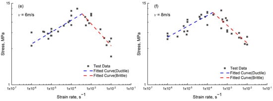 With the increase in strain rate, compressive strength underwent a process of an initial increase followed by a decrease. The peak limit stress of compressive strength occurred between the ductile and brittle regimes, termed the transition regime. In the transition regime, both ductile and brittle behaviors coexisted. However, from the stress–strain curve of the loading process, not only can we observe typical ductile and brittle process curves, as shown in Figure 8 and Figure 9, but it was even possible to simultaneously observe ductile and brittle characteristics within a single loading process (as shown in Figure 10).