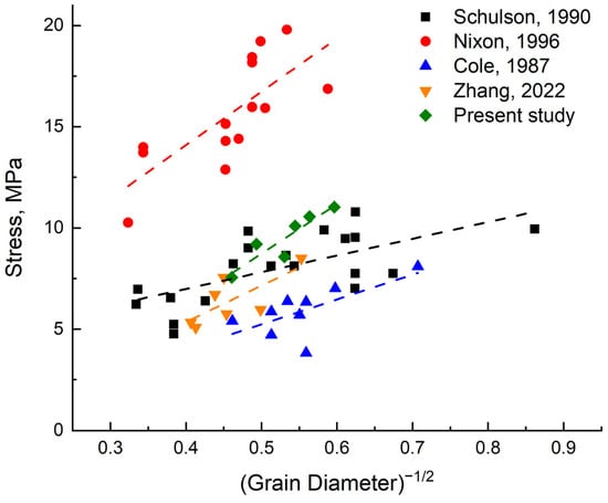 Stress versus grain size (Data from Schulson (1990) [], Nixon (1996) [], Cole (1987) [], Zhang (2022) [], and present study) and fitted curves.