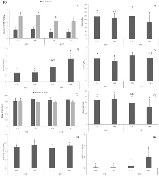 Effect of carbamazepine (CBZ) on life traits of Tigriopus fulvus in the F0 generation at 20 °C and 27 °C: (A) development time from naupliar to copepodite stage (N-C) and from naupliar to adult stage (i.e., ovigerous female) (N-Fov); (B) sex ratio (F/M); (C) body length of males and females; (D) hatching time; (E) number of nauplii per female; (F) number of broods per female; (G) number of nauplii per brood; (H) unhatched broods. Bars with different letters indicate significant differences between treatments and temperatures (p < 0.05).
