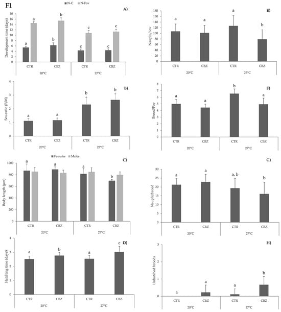 Effect of carbamazepine (CBZ) on life traits of Tigriopus fulvus in the F1 generation at 20 °C and 27 °C: (A) development time from naupliar to copepodite stage (N-C) and from naupliar to adult stage (i.e., ovigerous female) (N-Fov); (B) sex ratio (F/M); (C) body length of males and females; (D) hatching time; (E) number of nauplii per female; (F) number of broods per female; (G) number of nauplii per brood; (H) unhatched broods. Bars with different letters indicate significant differences between treatments and temperatures (p < 0.05).