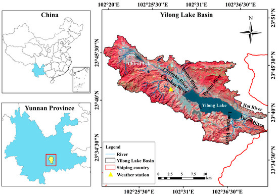 The Yilong Lake Basin is situated in Shiping County (23°38′37″–23°42′05″ N, 102°28′52″–102°38′49″ E), Yunnan Province, Southwest China. Covering an area of 360.4 km2 and ranging in altitude from 1289 m to 2180 m, it stands as the most southern freshwater lake on the plateau of Southern China (Figure 1). The Yilong Lake Basin is situated in a region characterized by a north subtropical arid monsoon and mid-subtropical semi-humid monsoon climate. Precipitation levels exhibit significant seasonal variations, with the wet season occurring from May to October and the dry season from November to April of the following year. Yilong Lake is nourished by six rivers: the Chenghe River, the Chengbei River, the Chengnan River, the Longgang River, the Dashui River, and the Yucun River. The Hai River is situated on the eastern bank of the lake, serving as its outlet.