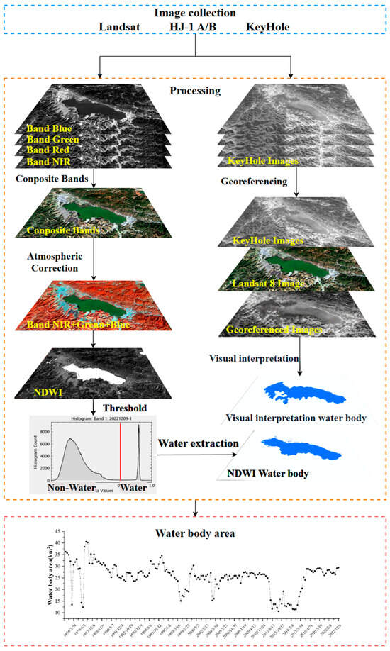 The KeyHole images were extracted through visual interpretation following correction. The application of NDWI has the potential to improve the visibility of water features in images by minimizing the presence of soil and land vegetation features. The images underwent radiometric and atmospheric corrections prior to the calculation of NDWI. A higher NDWI value indicates a greater probability of water presence within the pixel. Consequently, NDWI is frequently utilized for the extraction of the lake’s surface area information and the classification of pixels into water-related and non-water-related categories by establishing a threshold. The threshold selection for each sensor is detailed in Table S1. NDWI is computed using the following equation: