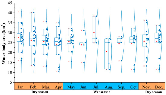 To analyze the monthly variations in the surface area of Yilong Lake, box plots were constructed (Figure 5). A consistent observation across these plots is the widening gap between the upper and lower boundaries of the boxes. This phenomenon is attributed to the increased cloud cover during the wet season in the Yilong Lake Basin, particularly from June to August, resulting in a limited number of available images during this period (Figure 2). Consequently, the distinction between dry and wet seasons is not evident in terms of median values, indicating the presence of fluctuating and uncertain changes in the lake’s surface area. More anomalous small values are particularly observed in March, April, October, and December, suggesting that the surface area of Yilong Lake typically contracts during the dry season (from November to April of the following year). Yilong Lake exhibits a monthly average area ranging from 25 to 30 km2, with the highest and lowest values of the average lake’s surface area recorded in July and June, specifically, 30.16 km2 and 23.86 km2, respectively. Based on the remote sensing images, the smallest and largest surface extents of Yilong Lake were observed in April (20 April 2013, 10.64 km2) and January (7 January 1986, 40.49 km2), respectively. In general, the surface area of Yilong Lake does not exhibit significant seasonal variations.