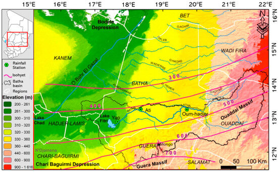 The study area is located in the eastern part of the Lake Chad basin. This basin is a large topographical depression divided between seven countries. Its limits are defined by a series of mountains arranged in a vast, more or less continuous arc (Hoggar, Adrar, Tibesti, Ennedi, Ouidai and Adamawa) and isolated plateaus (Jos and Aïr). The study area (Figure 1) covers a geographical area between 12°N and 16°N latitude and 16°E and 22°E longitude. Its hydrological limits are represented by the Bahr El Gazal and Ouaddi Achim wadis to the west and the north and by the Ouaddai and Guera massifs to the east and south-east. The western part of the area has relatively low topography, ranging from 230 m to 420 m above sea level. On the other hand, the topography on the southeastern border (Guera Massif) and the eastern border (Ouaddai Massif) varies from 900 m to 1600 m respectively.