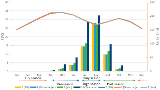 Monthly average precipitation (P) and temperature (T). Recording periods: 1990–2020 for the Yao, Ati, Oumhadjer stations and 1964–2020 for the N’Djamena station.