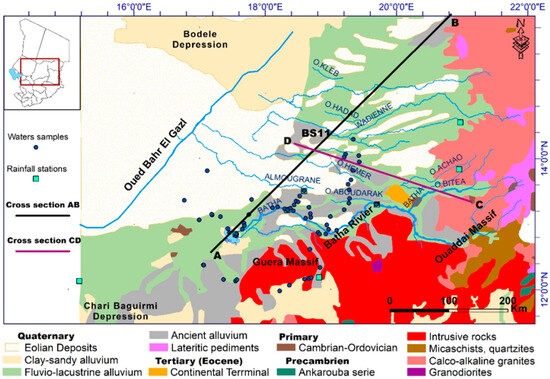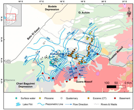 - Schneider, J.L.; Wolff, J.-P. Carte Géologique et Cartes Hydrogéologiques à 1/1,500,000 de la République du Tchad: Mémoire Explicatif (Vol.1, N° 209); BRGM Publisher: Orléans, France, 1992. [Google Scholar]