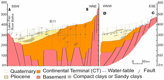 The sedimentary cover is composed of deposits from the Tertiary to the Quaternary [41,42,43,44], which all outcrop in the study area. From east to west, the lithology and thickness of these formations are variable [45,46]. In the studied area, the oldest sediments overlying the Precambrian rocks are Eocene in age, regionally called the Continental Terminal (CT) [39]. They correspond to fluvial and lacustrine deposits intercalated with sandy clays with ferruginous horizons and occasional oolitic beds [47]. In the southeastern part of the region, the top of the CT constitutes the substratum of the Quaternary deposits; the transition between the two is generally marked by the presence of lateritic clays or ferruginous sands. This west-east beveling of the CT is accompanied by a significant thickness variation, ranging from 100 to 350 m in the central zone (Figure 4) and from 10 to 50 m to the east of the area.