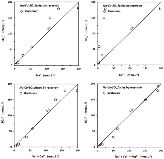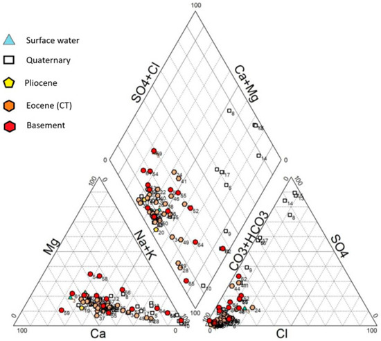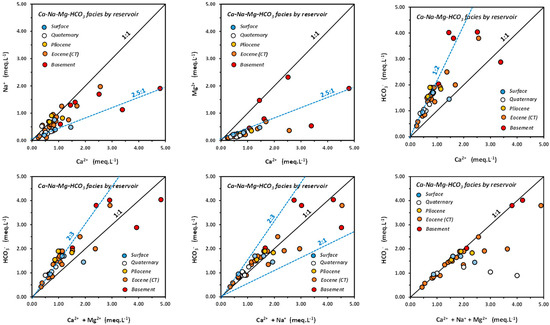 Similar to Na+, HCO3— concentrations are the highest and most variable in the Quaternary (7.41–12.83 meq/L) and the lowest in the basement (3.27–4.04 meq/L) and especially in the Eocene (1.90–3.09 meq/L). The same behavior exists for sulfates and chlorides: Quaternary (0.46 > SO42− > 4.36 meq/L; 0.22 > Cl− > 0.98 meq/L), basement (0.28 > SO42− > 0.73 meq/L; 0.22 > Cl− > 0.54 meq/L), and Eocene (0.06 > SO42− > 0.77 meq/L: 0.08 > Cl− > 0.18 meq/L).