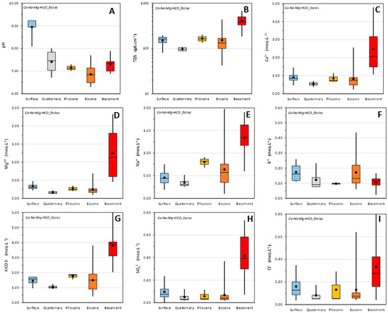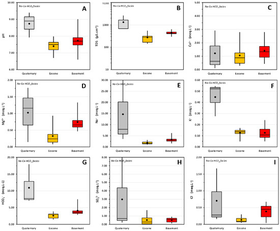 As before, quartiles Q1 and Q3 show that these facies are more accurately defined as a Na-Ca-HCO3 facies, which is only present in the Quaternary, Eocene, and basement reservoirs. These waters are characterized (Figure 8) by slightly alkaline pH values in the Eocene (7.19–7.63) and basement (7.47–7.91) and alkaline pH values in the Quaternary (8.41–9.15). In terms of mineralization, the TDS values are low in the Eocene (167–314 µS/cm), moderate in the basement (403–479 µS/cm), and quite high in the Quaternary (675–1653 µS/cm).