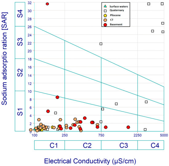 where [Na+], [Ca++], and [Mg++] are the concentrations of sodium, calcium, and magnesium in milliequivalents per liter. The SAR is an indicator to assess the potential infiltration hazards associated with irrigation water. High SAR values are indicators of a significant risk of sodium-induced dispersion and soil structure problems, which ultimately may prevent water infiltration into the soil profile [70,71,72]. The following SAR value thresholds are commonly used to classify water suitable for irrigation: SAR < 10—Good Quality, no restriction on use; 10 ≤ SAR < 18—Acceptable Quality; SAR ≥ 18—Non-Acceptable Quality [73,74,75]. In the present study, a large part of the samples (89%), from the river and from all aquifers, is considered as of good to acceptable quality for irrigation (Table 2). The remaining samples, deemed unacceptable, come from the Quaternary (six samples) and the basement (one sample). It should be noted that both criteria (EC and SAR) discriminate the same groundwater samples as being incompatible with the practice of rational irrigation. The SAR and EC data were plotted on a SAR vs. EC diagram (Figure 10).