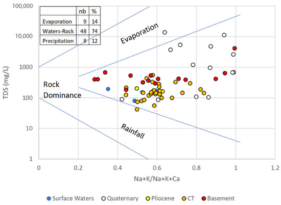 The quality of water intended for human consumption and domestic use was assessed based on standards set by the World Health Organization [58]. The results (Table 1) show that recent Quaternary waters (excluding K+) and basement waters (excluding Mg2+, K+, and Cl−) have values exceeding the recommended limits. The CT formation has a bicarbonate value that exceeds the WHO’s recommended standard. The pH of surface waters, ranging from 8.1 to 9.2, is higher than the recommended limit.