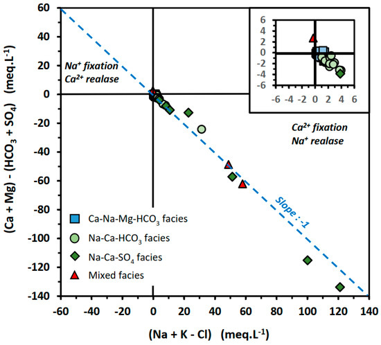 This facies is specific to Quaternary waters (Table 1) and is characterized by slightly alkaline pH values (7.43–8.09). However, these are highly mineralized waters, as indicated by their high TDS values (1077–8024 µS/cm). Although the major cation is Na+ (9.4–82.2 meq/L), it is associated with significant amounts of Ca2+ (3.0–16.4 meq/L) and Mg2+ (1.6–16.0 meq/L). It is also associated with potassium, which is the minor cation (0.4–1.6 meq/L). Likewise, if SO42− concentrations are dominant (8.4–104.0 meq/L), bicarbonates are also abundant (5.4–6.9 meq/L) compared to the highest concentrations observed in strictly bicarbonate facies. Finally, Cl− concentrations vary considerably (0.3–8.6 meq/L).