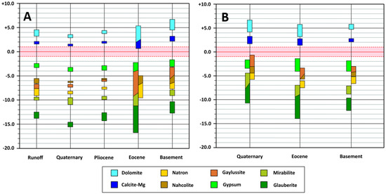 where IAP is the ion activity product, which is the product of the activities of the ions in solution that form the mineral; Ks is the solubility product constant of the mineral. The activities have been calculated using the generalized Debye–Hückel equation [56], and values of Ks correspond to those of the main salts found in evaporitic environments [57].