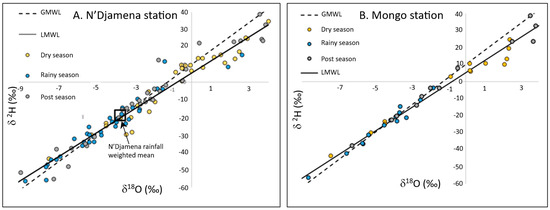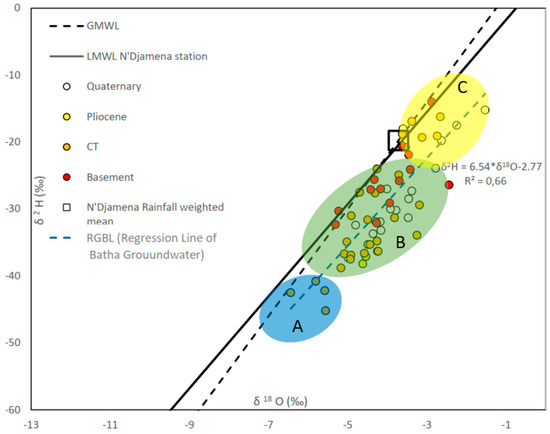 For major ions, 65 samples were analyzed. For isotope geochemistry, 18O and 2H (65 samples) and 3H (44 samples) were analyzed. Recent data of 2H and 18O were collected from the Global Network for Isotopes in Precipitation (GNIP) [51] for stations 6,475,800 (Mongo) and 6,470,000 (N’Djamena) to determine the local meteoric line for the study area. This meteoric line refers to stable isotope concentrations in precipitation.