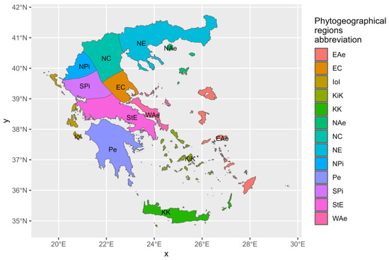 The phytogeographical regions of Greece as defined by Strid and Tan (1997) [46]. Peloponnisos (Pe), North Central (NC), East Aegean Islands (EAe), Ionian Islands (IoI), East Central (EC), Kriti and Karpathos (KK), North Aegean Islands (NAe), Kiklades (KiK), West Aegean Islands (WAe), North East (NE), Southern Pindos (SPi), Sterea Ellas (StE), and Northern Pindos (NPi).