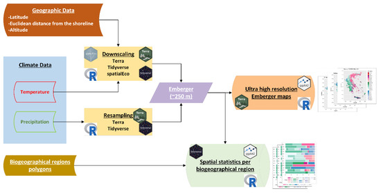The WorldClim dataset [104], which has been used for various research topics, including ecology and agriculture from a climatic point of view [105,106,107,108,109,110,111,112], is the atmospheric dataset source for this study. More specifically, for future projections, we use the Met Office Hadley Centre HadGEM3-GC31-LL model results. From the initial resolution of ~1 km, we downscaled statistically (utilizing altitude, latitude, and Euclidean distance from the shoreline) the temperature parameters to ~250 m resolution with the SpatialEco [113] R language package. The precipitation data was resampled via the bilinear method to the same resolution. For the calculations and the mapping, the Tidyverse [114] package, especially dplyr [115] and gglot2 [116], along with the terra [117] geospatial R package, were used (Figure 2).