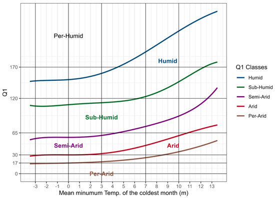 The final characterization of the Q2 is the combination of the Q1 and the m, as displayed in Table 4. For example, when calculating the Q1 as 4 and the m as 5, the Q2 classification is characterized by the ‘Per-Arid Temperate (PeAr-Te)’ class.