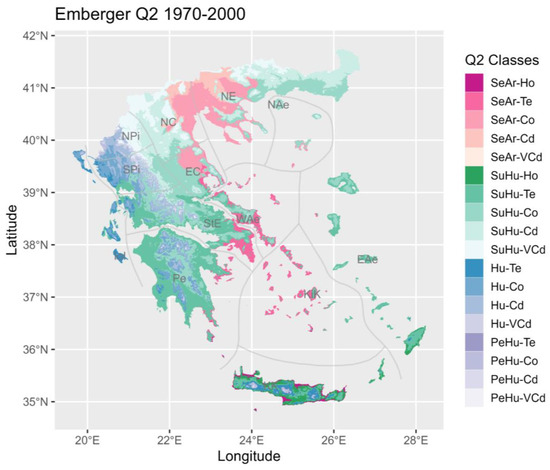 Spatial distribution of the Emberger Q2 classes for the reference period (1970–2000) over the phytogeographical regions of Greece.