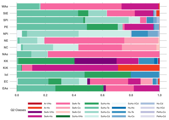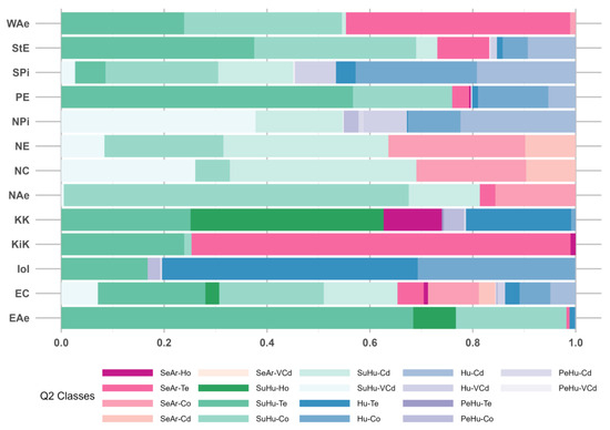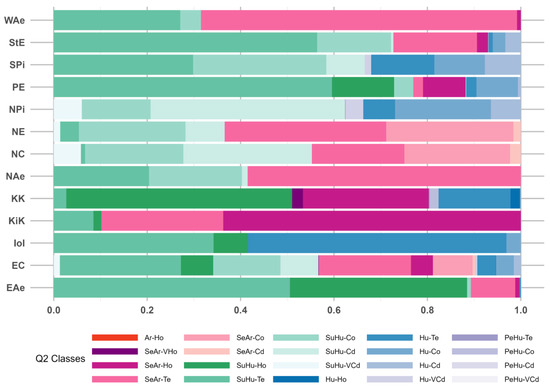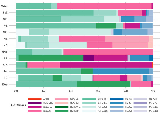 Overall, the resulting Q2 classes’ relative % coverage per phytogeographical region (Figure 4 and Table S6) shows dominant distributions among the SeAr-Te (74% over Kiklades (KiK) and 44% for the West Aegean Islands (WAe)), the SuHu-Te (68% for EAe and 57% for Pe), the SuHu-Co (67% for the North Aegean Islands (NAe)) and the SuHu-Cd (36% over NC). The more humid Hu category also appears, mainly falling within the temperature conditions of Te (50% in the Ionian Islands (IoI)), Co (31% in IoI), and Cd (22% in NPi and 19% in SPi).
