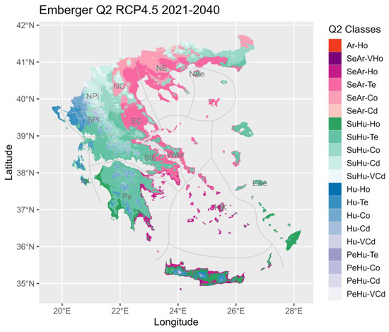 Spatial distribution of the Emberger Q2 classes for the RCP4.5 scenario and 2021–2040 period over the phytogeographical regions of Greece.
