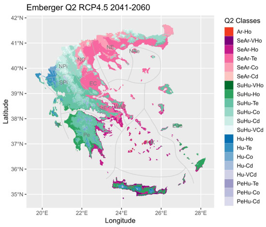 Spatial distribution of the Emberger Q2 classes for the RCP4.5 scenario and 2041–2060 period over the phytogeographical regions of Greece.