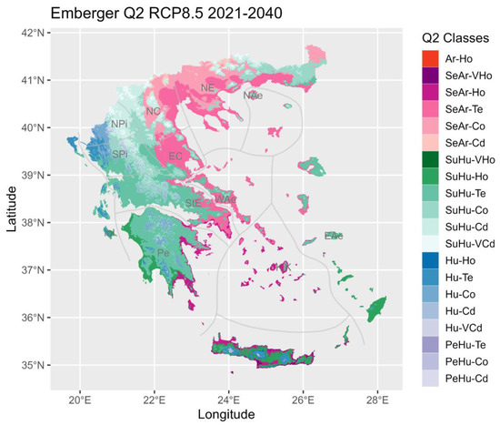 Spatial distribution of the Emberger Q2 classes for the RCP8.5 scenario and the 2021–2040 period over the phytogeographical regions of Greece.