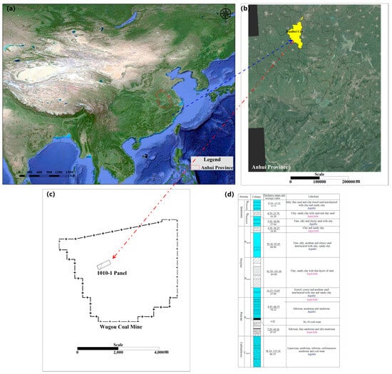 The location map of Anhui Province in China (a), the Wugou coal mine in Huaibei city (b), 1010-1 panel in the Wugou coal mine (c), and the geological column of the 1010-1 panel (d).