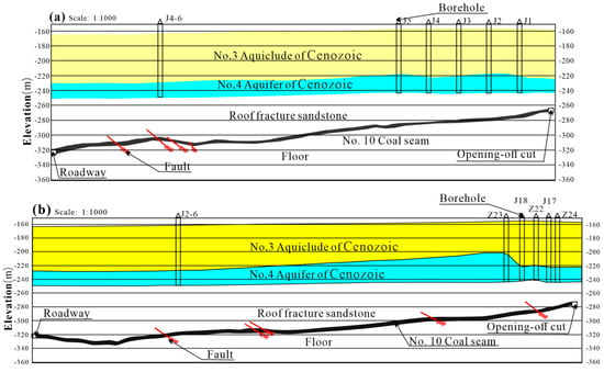 The mine water primarily originates from the sandstone aquifer of the Shanxi Group, the weathered zone, and the No. 4 unconsolidated sand aquifer (No. 4 aquifer) from the Cenozoic era, as shown in Figure 2a. These aquifers with poor yield are dominated by static groundwater reserves. After the coal was mined out, the conductive fracture zone was subsequently developed, which disturbed these aquifers, leading to the formation of water–sand mixture inrushes. An exploration survey with the pumping tests for the No. 4 aquifer demonstrated that its hydraulic conductivity ranges from 0.011299 m/d to 0.435720 m/d, and its specific flow is between 0.0017 L/(s·m) and 0.1352 L/(s·m). These hydrogeological parameters reveal that a high mud content is a property of the No. 4 aquifer []. The combination of poor recharge conditions and lower hydraulic conductivity are induced the static storage and poor yield. The local groundwater circulation between the roof sandstone aquifer of the coal seam, weathered zone, and the No. 4 aquifer is controlled by the regional streamline flow. As for this hydrogeological framework and the profiles of panel 1010-1 as shown in Figure 2b, the safe coal–rock pillar is higher when the stopping line is far from the opening-off cut. Therefore, the most threated space is the opening-off cut, which may be influenced by the water–sand mixture inrush from the No. 4 aquifer.