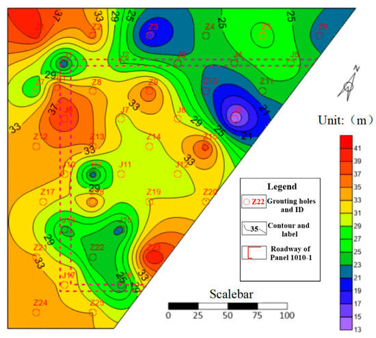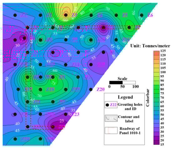 According to the findings from the inter-hole parallel electrical method [,], the effectiveness of the grouting transformation in the overlying No. 4 aquifer and the weathering zone of the 1010-1 panel was evident. Although there were still localized areas with low resistivity values [], the majority of the area showed higher apparent resistivity values, which points toward a remarkable improvement resulting from the grouting process.