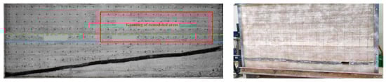 The fissure development pattern in the trending profile at the end of mining is depicted in Figure 15a. The panel advanced from the right side (the opening-cut location) to the left (the stopping line), and as the buried depth increased, the fissures in the roof overburden gradually developed. The measurements indicate that in the ungrouted model of the trending section, the height of the caving zone was 18.91 m, and the height of the water-conductive fracture zone was 74.47 m. The maximum height of the water-conductive fracture zone was situated above the opening cut area. In the grouted model (Figure 15b), upon completion of mining, the height of the caving zone was 13.82 m, and the height of the water-conductive fracture zone was reduced to 61.14 m. Similarly, the maximum height of the water-conductive fracture zone remained above the opening-cut area. These reductions in the height of the caving zone and water-conductive fracture zone indicate that the process of grouting the No. 4 aquifer effectively transformed the stratum’s properties and mitigated the damage from roof overburden. Moreover, the grouting modification caused a certain degree of hysteresis in roof damage [], decelerating the rate of roof degradation in comparison to the ungrouted scenario. Additionally, post-grouting modifications enhanced the overall integrity of the No. 4 aquifer and the weathering zone, ultimately increasing their strength []. This improvement led to a decrease in the roof plate subsidence compared to the pre-grouting condition, which can consequently reduce surface subsidence to a certain extent.