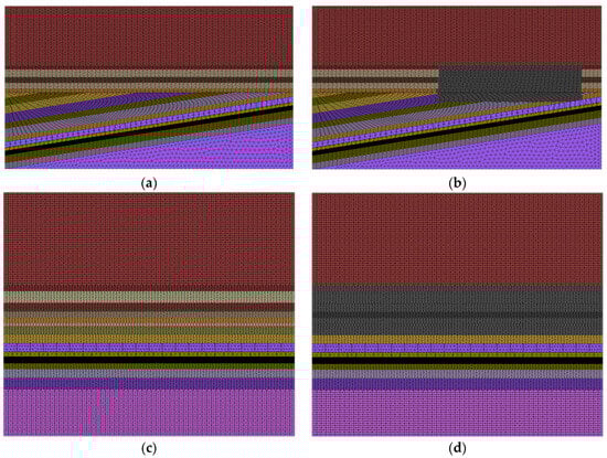 Different profiles of ungrouted and grouted scenarios in the numerical simulation models. (a) Trending profile of the ungrouted model. (b) Trending profile of the grouted model. (c) Dipping profile of the ungrouted model. (d) Dipping profile of the grouted model.