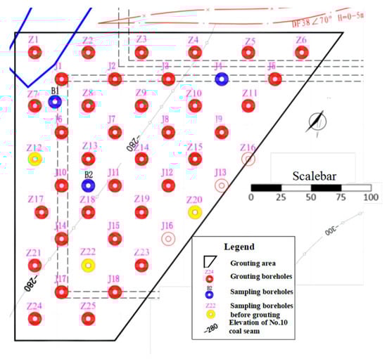 In the study area, the No. 4 aquifer is known for its relatively shallow burial depth, measuring an average of 270 m, along with its irregular thickness and intricate lithology. The weathering zone of the underlying bedrock varies significantly in thickness, ranging from 4.5 m to 45.6 m, with a prevailing range of 15 m to 25 m and an average value of 22 m. Additionally, there is a pronounced strong weathering zone with a thickness ranging from 0.41 m to 37 m, averaging about 13 m. In response to the challenges posed by these geological conditions [], squeezing and splitting grouting techniques have been employed to create a consolidated layer with a fixed skeleton within the No. 4 aquifer, as shown in Figure 6. This process reduces the water saturation of the reformed strata, transforming the aquifer into a weakly water-rich or nearly drained Class III water body. Simultaneously, this grouted treatment enhances the overall strength of the No. 4 aquifer, thereby mitigating the risk of sudden water–sand mixture inrush [] during underground mining operations. Moreover, this approach facilitates the extraction of resources from the shallow coal pillars. On the basis of the grouted treatment of the No. 4 aquifer, it is recommended to extend the grouted drill holes into the weathering zone of the bedrock to reinforce this zone. This proactive step aims to prevent water–sand mixture inrush incidents during underground mining activities, ultimately ensuring the safety and stability of such operations.