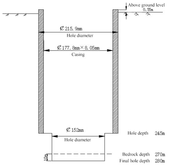 The construction process involves the utilization of the vertical boreholes arranged row by row to disperse the water and consolidate the sand. The boreholes, as indicated in Figure 7, have specific structural features. The first section of boreholes, extending approximately 25 m above the bedrock surface, has a hole depth of around 245 m and a diameter of 215.9 mm. These boreholes are encased in a Φ177.8 × 8.05 mm casing and cemented. The second section of boreholes features with a diameter of 152 mm, with downstream segmented grouting governance and a unit section length of 4 to 6 m. Finally, the third section of boreholes extends to approximately 10 m below the top surface of the bedrock.