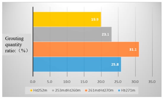 The analysis for the feasibility of grouting the No. 4 aquifer based on the field project is presented in Figure 8. The overall grouting ability was measured at 50.8 t/m; with the injectability, it was reduced to 47.7 t/m when excluding the pre-existing grouting holes Z3 and Z4. The unit grouting amount of the coring inspection boreholes averaged 15.9 t/m. However, for boreholes J4, B1, and B2, the unit grouting amounts were 19.2 t/m and 43.6 t/m, respectively, with an average of 26.8 t/m. It is important to note that after grouting, the injectability of the inspection boreholes was significantly less than the overall injectability. The middle and lower sections were more injectable than the upper section, as shown in Figure 9.