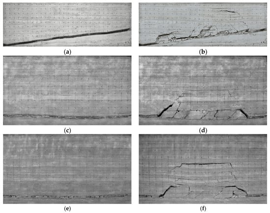 Photos taken from material test in trending and dipping directions before/after being grouted. (a) Pre-mining of trending profiles. (b) Post-mining of trending profiles. (c) Pre-mining of dipping profiles (grouted). (d) Post-mining of dipping profiles (grouted). (e) Pre-mining of dipping profile (ungrouted). (f) Post-mining of dipping profile (ungrouted).