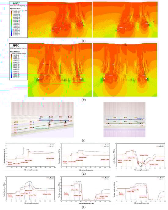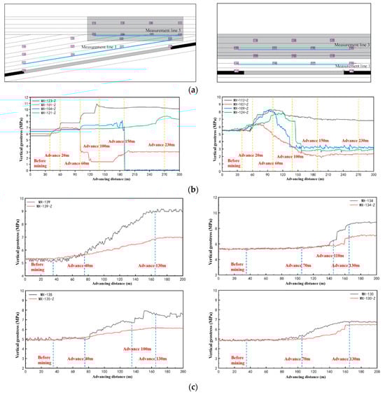 Stress measurement points in the trending and dipping profile were designed and are shown in Figure 11. Figure 11b depicts the stress variation curves along the survey line at various advanced distances within the trending profile. The model indicates that the original stress equilibrium state of the overburden rock was disrupted upon the excavation of the panel from the opening cut. With the advancement of the panel, the stress state of each measurement point along measurement line 1 underwent continuous alterations, with the stress value following a pattern of “stable–slowly rising–suddenly falling–stable”. Similarly, measurement line 5 demonstrated incremental changes in the stress values at each measurement point, with an overarching trend of “rise–fall–balance” changes. In comparison to the stress change pattern observed in line 1, certain measurement points in line 5 manifested a more moderate stress variation trend. This moderation can be attributed to the distance from the mining area and the presence of an overlying loose layer, resulting in a more moderate stress change trend within this region.