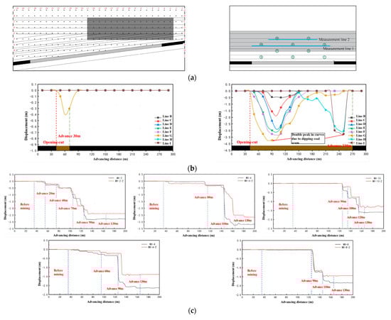 During the initial stages of mining, cracks propagated upwards along the quarry, continuously intersecting with the direct roof strata. This led to the gradual deterioration of the direct roof, which exhibited a tendency to collapse downwards. Upon completion of the panel advance, the caving zone and the water-conductive fracture zone became essentially developed and stabilized. This process is illustrated in Figure 12b, which depicts the dynamic evolution of the displacement of each line of measurement at different advanced distances in the trending profile. As a result of these developments, the emergence of a “double peak” phenomenon in the top plate sinking curve can be observed.