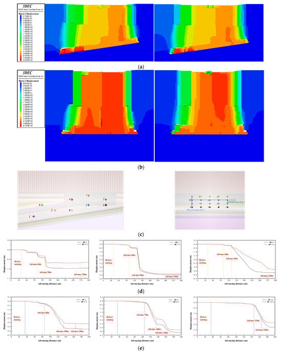 Figure 13a presents a cloud view of the quarry displacement upon completion of the trending profile. In the pre-mining stage, grouting produced a beneficial effect on controlling the fractures of the rock formation and reducing displacement. The range of large displacement areas in the grouting model was significantly smaller than that in the ungrouted model, as shown in Figure 13c,d. Notably, through the opening cut and the left side of the stopping area, it was evident that the displacement-affected area in the ungrouted model was considerably larger []. This highlights that grouting into the No. 4 aquifer can effectively reduce the displacement around the panel, thereby reducing the subsidence area scope.