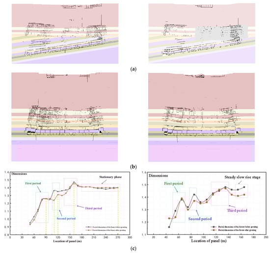 Quantitative calculations were performed to determine the fractal dimensions of the overburden fissures at various mining stages, both before and after grouting. These calculations provided insights into the progression of the fracture generation, connection, and development induced by mining activities. In the numerical simulation of the trending profile, the evolution of the fractal dimensions of the fractures was analyzed by plotting them against the advanced distances before and after grouting, as shown in Figure 15c. It was evident from the analysis that the fractal dimension graphs of both the grouted and ungrouted models exhibited characteristic distribution patterns, demonstrating three variable dimensional cycles and one steady dimensional stage throughout the coal seam mining process [].