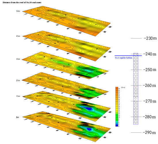 Figure 16 shows the results of the inter-hole electrodynamics for detecting apparent resistivity at various elevations, depicting horizontal slices ranging from 5 m to 50 m on the roof of the 1010-1 panel. The apparent resistivity slices displayed in Figure 16 revealed the presence of a predominantly low resistance area, which was primarily located amidst the sandstone and mudstone layers on the roof of the 1010-1 panel. This observation stems from the results of the inter-hole parallel electrical method exploration. From the integration of these findings with the geological data and on-site drilling observations, it was inferred that the low resistance area may be caused by the influence of grouting or fissure water within the sandstone layer on the roof. Furthermore, the resistivity slices at 45 m and 50 m on the roof portrayed the situation of the No. 4 aquifer within the management section. The majority of the regions in these slices exhibited high visual resistivity values and a low water content, indicating that the grouting transformation in this section had been successful.