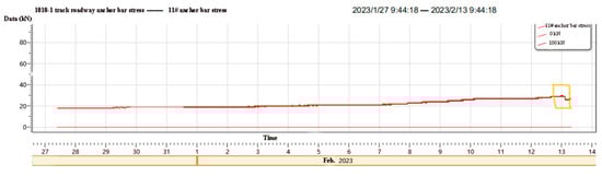 The stress monitoring data from the anchor bar at the track roadway and the working resistance data from the hydraulic support in the panel were analyzed. As the excavation of the 1010-1 panel progressed, the stress data from the track roadway anchor bar continued to change, as shown in Figure 17. Prior to January 29, 2023, the stress level of the anchor bar at the wind roadway was relatively stable []. However, as the 1010-1 panel advanced approximately 9.5 m, the stress on the anchor began to gradually increase due to the impact of mining on the surrounding rock at the roadway. The stress of the anchor at the track roadway increased rapidly at about 27.1 m of the panel advancement, reaching a peak at about 40 m of the panel advancement. Following this peak, the stress on the anchor suddenly decreased and stabilized rapidly. Moreover, the field measurements illustrated that none of the hydraulic supports reached their designed working pressures during the coal seam excavation in the grouted area.
