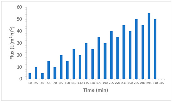 A clean water filtration test was carried out before (CW1) and after (CW2) the sludge filtration test. The CW filtration tests were carried out at a single flux rate of 55 L·(m2·h)−1 for 10 min, while the sludge filtration test was carried out at different flux ranges from 5 to 55 L·(m2·h)−1 (Figure 1). During the sludge filtration test, the flux was increased in steps of 10 min each. After each step, a relaxation time of 5 min was allowed to remove the reversible cake layer by air flushing. At the end of the sludge filtration test, the membrane was gently washed with demineralized water to remove the cake layer. By manually removing the cake layer, the cake layer resistance is assumed to be 0. In our experiment, variable flux was used to investigate its effect on TMP change. The sludge filtration allows the estimation of the different contributors to the total membrane resistance, based on the clean water tests CW1 and CW2.