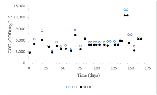 The MLSS of the seed sludge was 11.7 g·L−1 and MLVSS was 9.6 g·L−1 (Figure 5). On day 4, the MLSS decreased to 6.65 g·L−1. The sudden decrease in the MLSS is attributed to washout of loose sludge flocs due to bad settling. The decline in MLSS continued until day 44, when it became stable. At this point, a SRT of 30 days was applied. From day 44 to day 98, the MLSS values were between 6 g·L−1 and 8.6 g·L−1. On day 140, the MLSS reached 10.4 g·L−1 when a high COD of 14,050 mg·L−1 was fed [39]. From day 145, the SRT was lowered to 25 days to reduce the sludge concentration for proper aeration. In Figure 5 the evolution of the ML(V)SS is given.